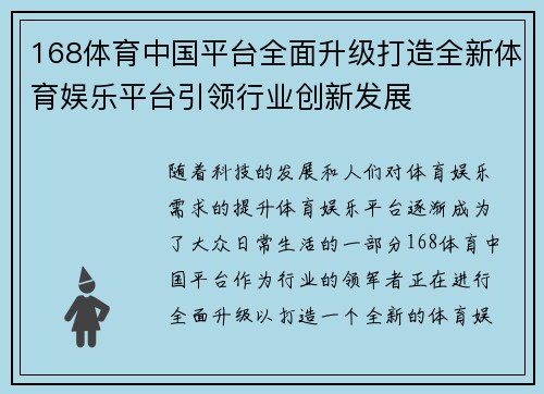 随着科技的发展和人们对体育娱乐需求的提升,体育娱乐平台逐渐成为了大众日常生活的一部分。168体育中国平台,作为行业的领军者,正在进行全面升级,以打造一个全新的体育娱乐平台,积极引领行业创新发展。这一升级不仅体现在平台功能的优化与用户体验的提升,还包括多元化的内容呈现、先进的技术支持以及深入的行业合作等方面。本文将从四个角度详细阐述168体育中国平台如何通过全面升级来引领体育娱乐行业的创新发展,并探讨这一转型对平台、用户和行业所带来的深远影响。